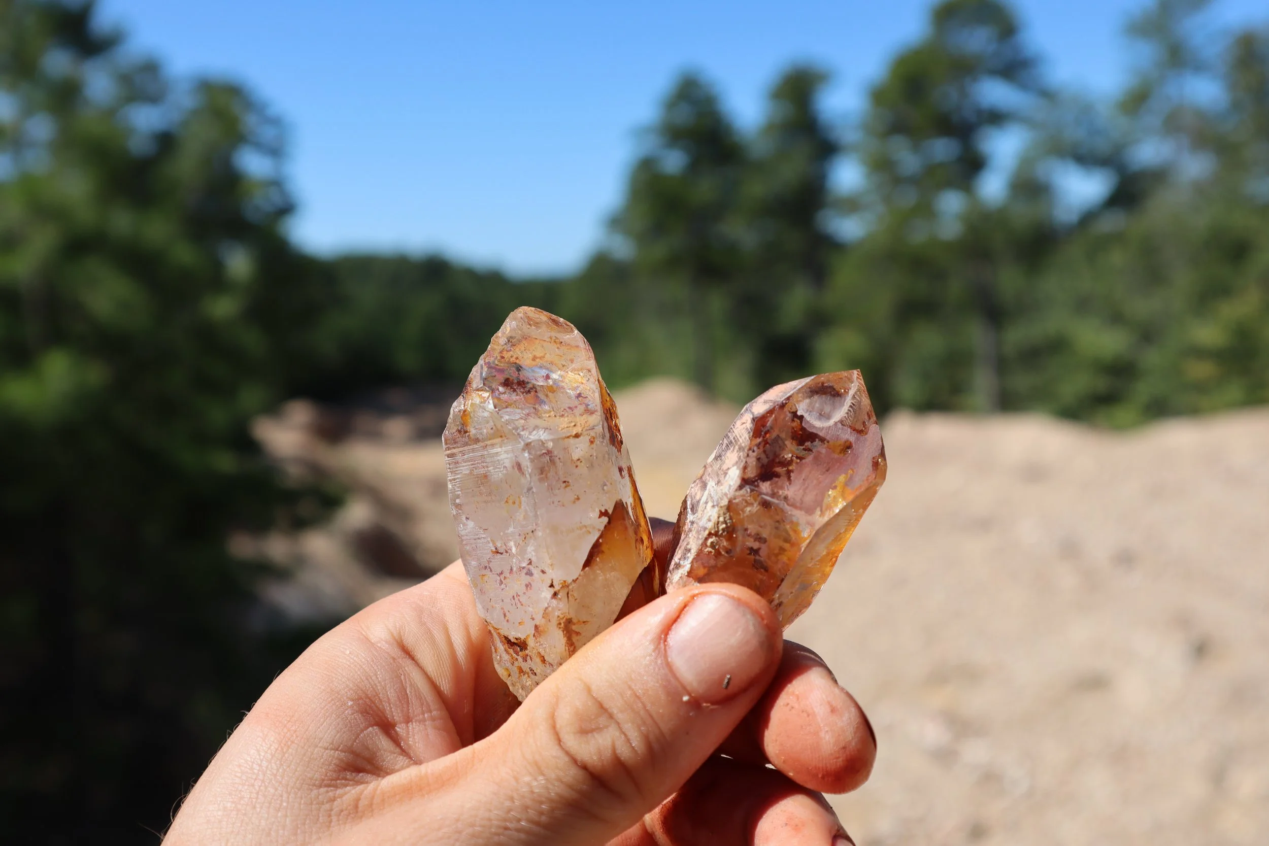 The crystals found here exhibit a heavy coating of iron- oxides and other minerals, which sometimes makes them hard to see and definitely harder to clean once retrieved from the ground. The heavy surface mineral deposits also make for some really unique specimens though like quartz covered in iridescent hematite for example.
